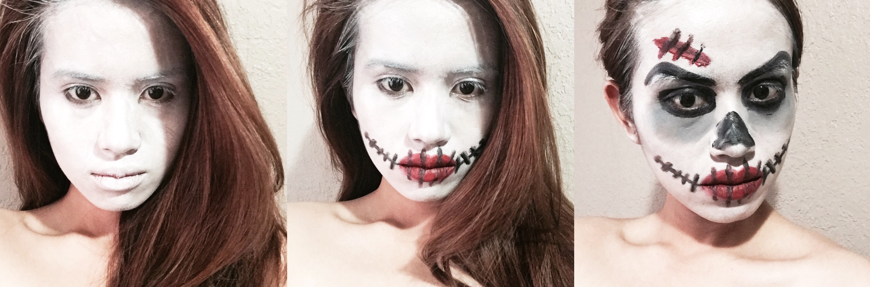 Let’s talk about my make up, or let’s say face paint, whatever you may call it. My first idea was The Joker. I was so excited, googled tons of Joker’s images to have my own basis and copy while doing it on my face but then what happened was not according to my plan. As usual, mine looked lame. The good thing about Halloween is that you don’t actually have to be pretty or something (unless you portray a fairy god mother or princess, something like that) Zombies are in so might as well.