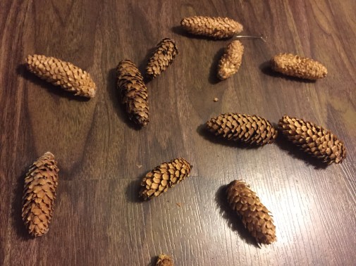 1) Collect the pine cones (you could get them at the nearby park or just directly from the tree)