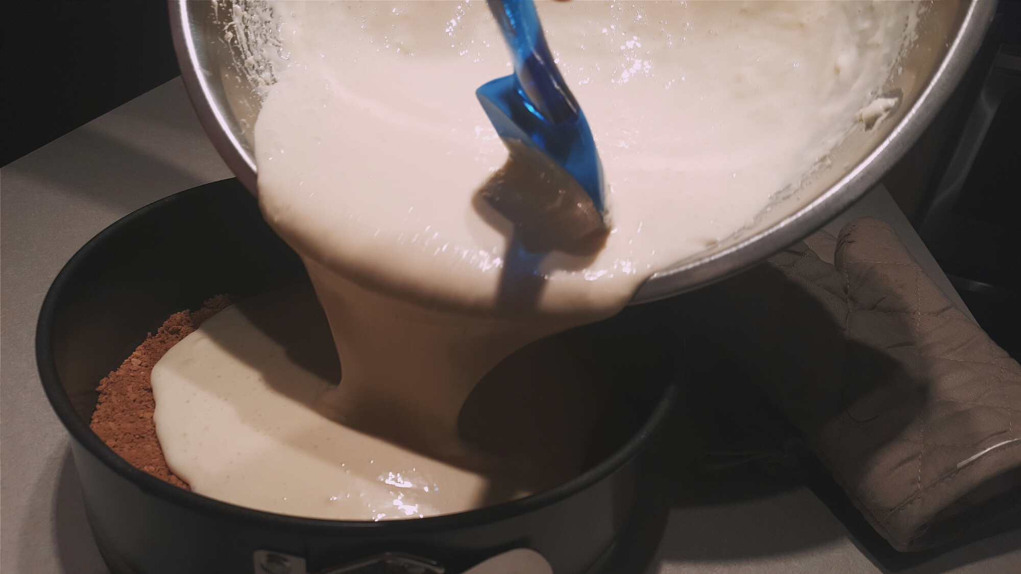 10. Pour on the mixture onto the spring form pan with pressed crust.