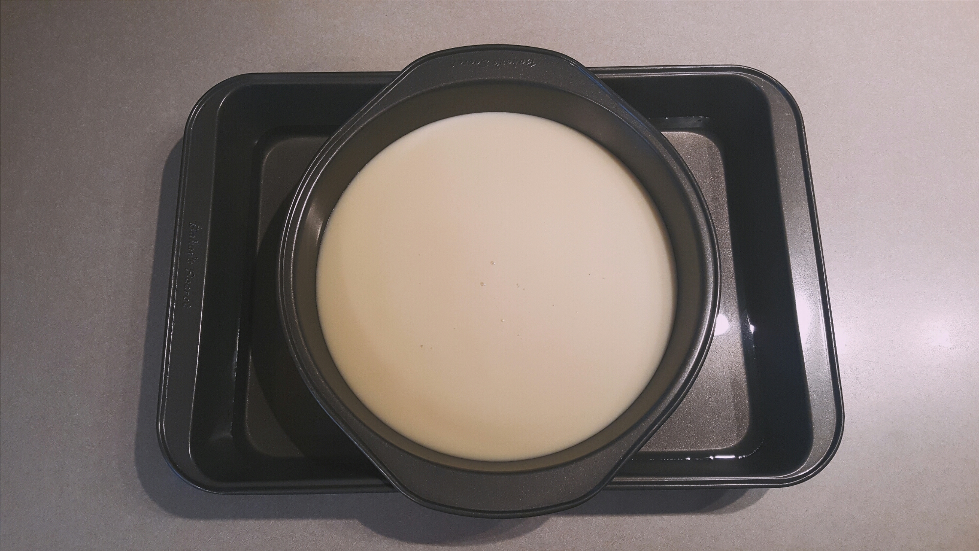 4. Pour on the condensed milk in a pie pan, cover it with foil and steam it under an inch of boiling water. Use the preheated oven from the step 1 to do this. Wait for an hour. (Caramelization process)