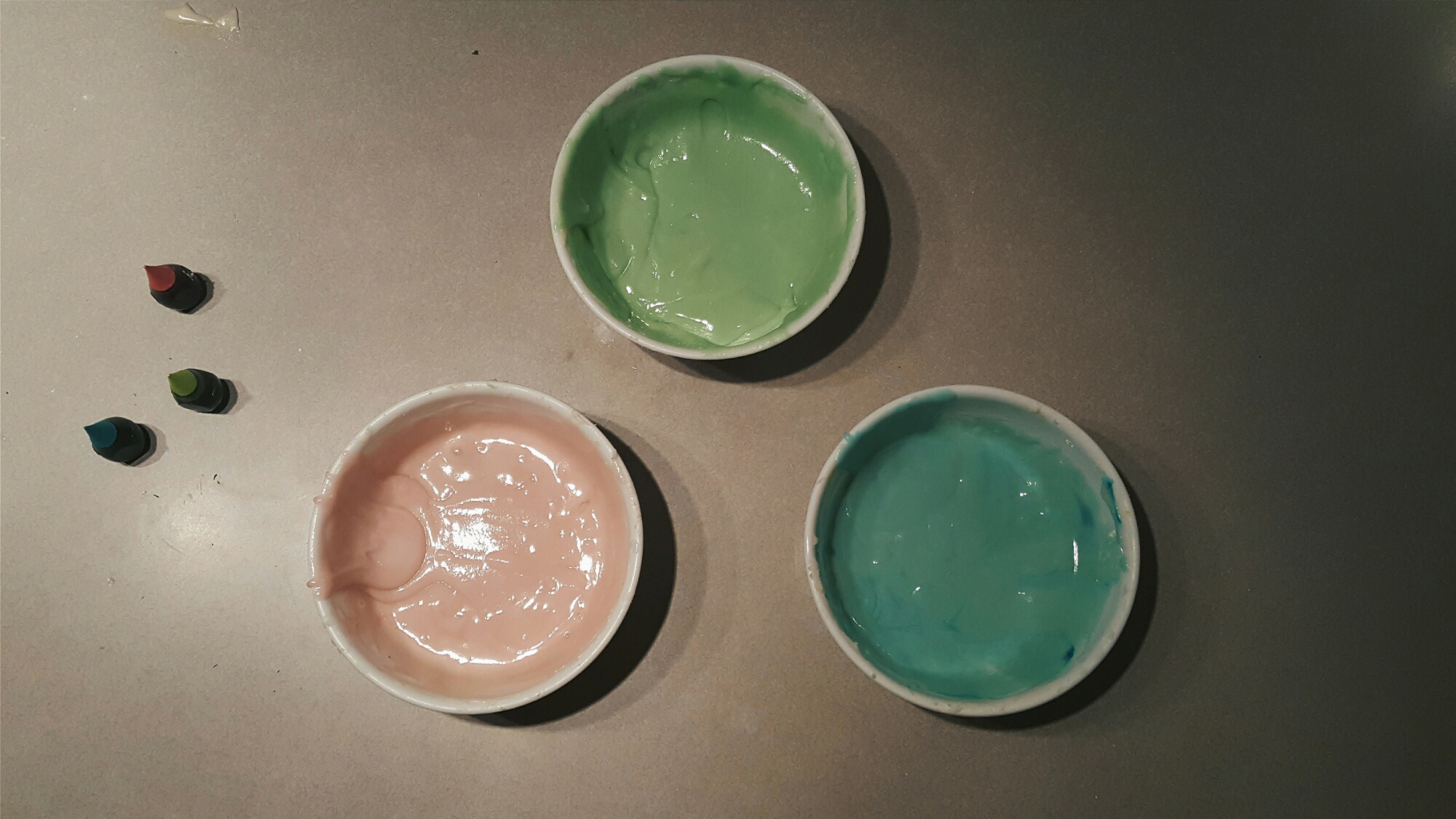 - Put into 3 separate bowls for mixing of variety of colors. *Number of colors upon your discretion. In my recipe, I used 3 colors. (Pink, Mint Green, Sky Blue)*
