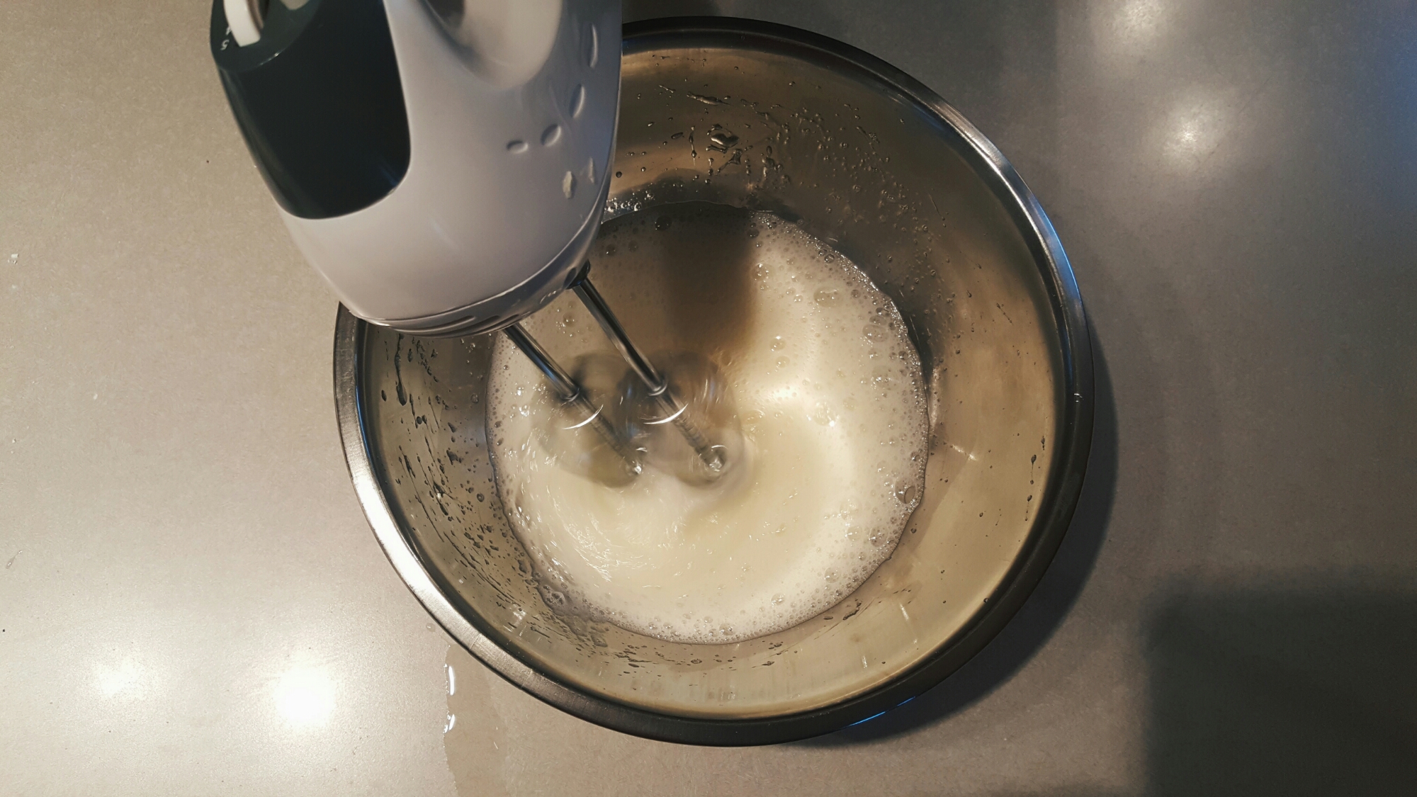 - In a separate bowl, mix in the egg whites until frothy. Add vanilla base.